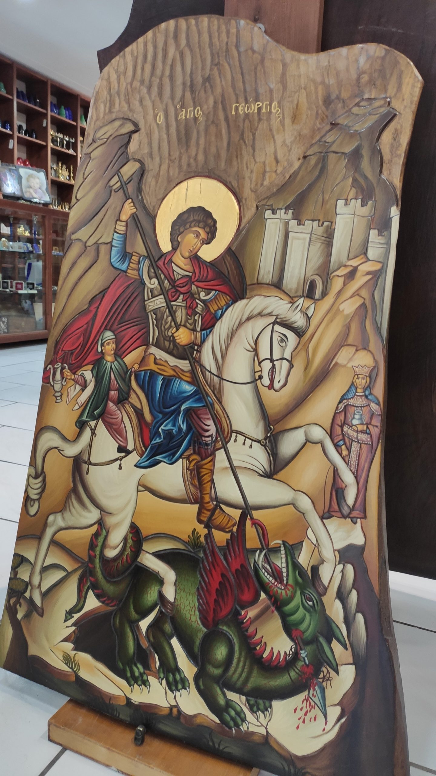 Ξυλόγλυπτη χειροποίητη εικόνα σκαλισμένη σε τέσσερα επίπεδα βάθους από μασίφ ξύλο οξιάς και αγιογραφιμένη με αυγοτέμπερα